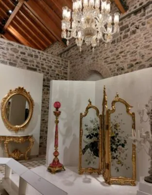 1800’lerden kalma Osmanlı dönemi avize ve kandiller, bir zamanlar sarayları aydınlatmış olabilir. Camdan süzülen ışık, tarihî gölgeleri hâlâ duvarlara düşürüyor gibi.
